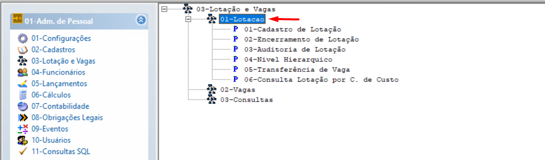Após clicar, serão exibidos os itens disponíveis, clique em 01-Lotação para verificar os itens referentes à lotação. Dê um duplo clique sobre o item 01-Cadastro de Lotação e será aberta uma tela para cadastro e manutenção.