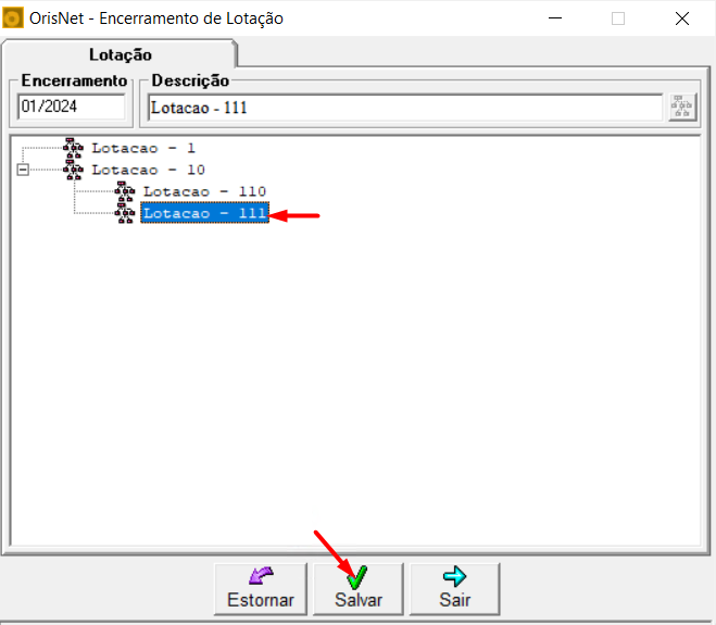 No item 01-Lotação, dê um duplo clique sobre o item 02-Encerramento de Lotação e será aberta uma tela para selecionar a lotação a ser encerrada.
