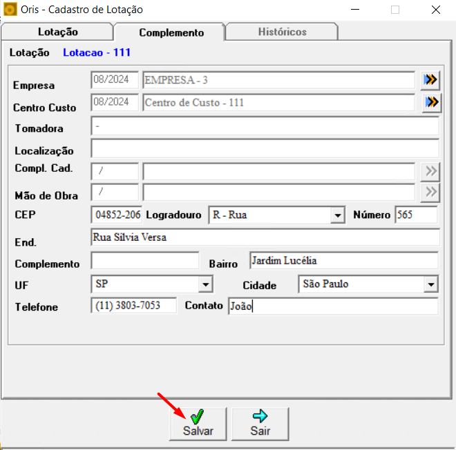 Ao clicar em Voltar e retornar para a aba Complemento, clique em Salvar para registrar a exclusão da empresa e do centro de custo.