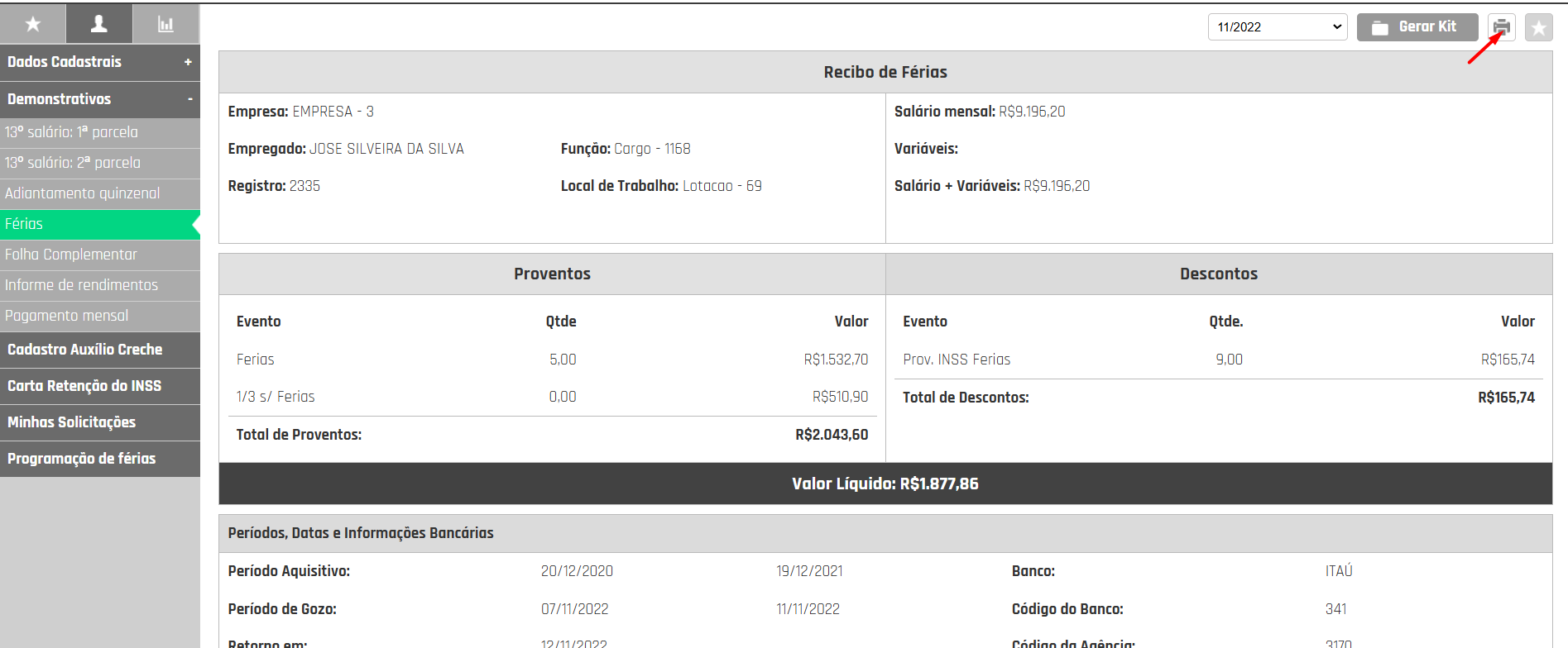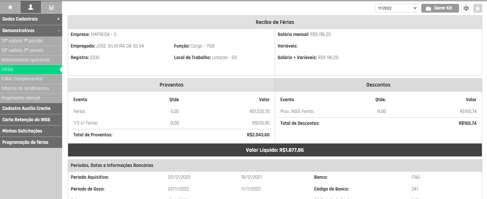 Neste menu, é possível visualizar todas as informações referentes ao pagamento de férias.