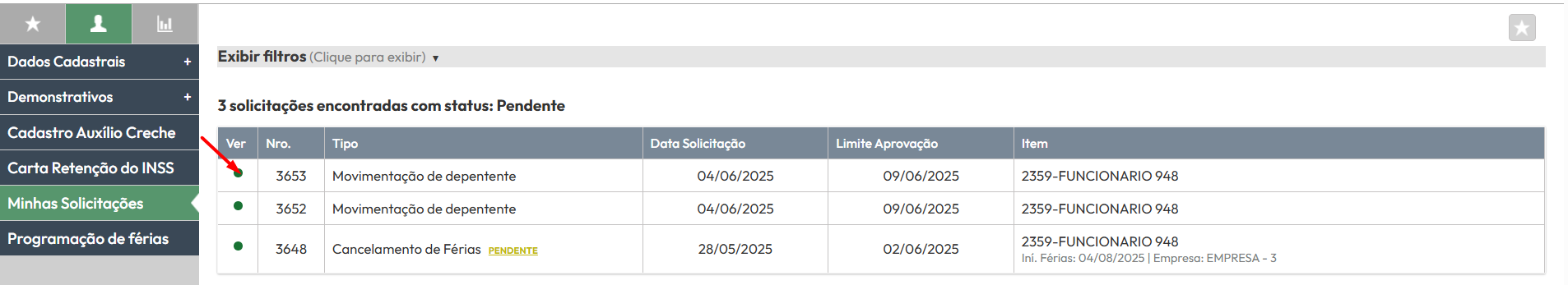 Nos casos em que existe workflow configurado, as inclusões e alterações de dependentes ficam pendentes de aprovação. Para acompanhar essas solicitações, clique em Minhas Solicitações.