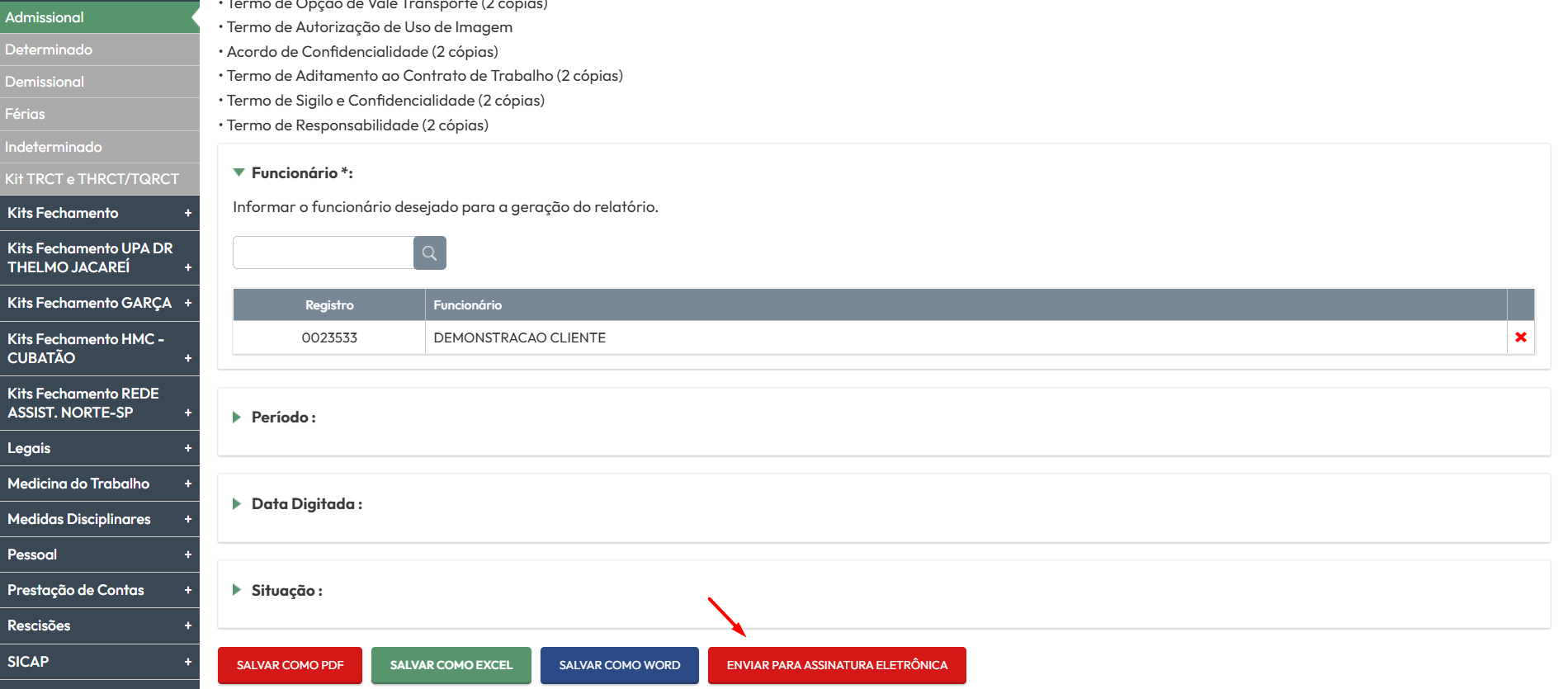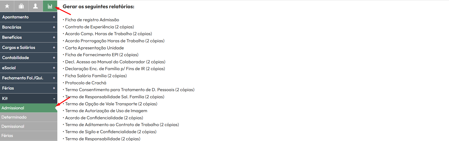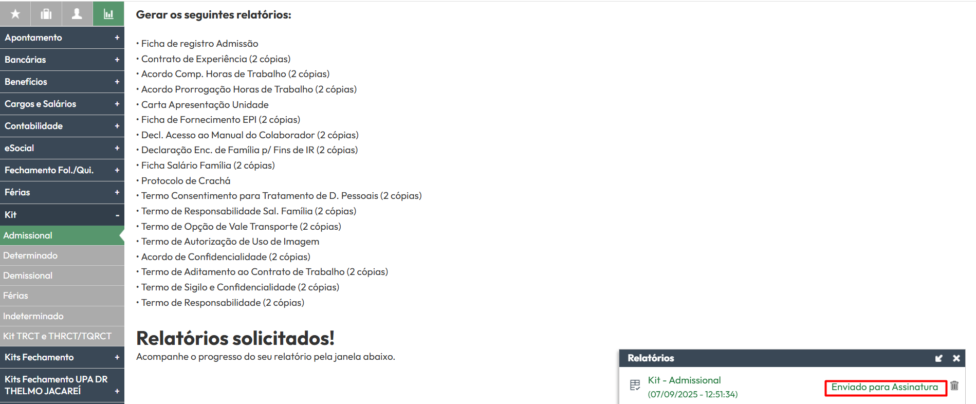 Após a efetivação da admissão, acessar a aba Relatórios, clicar no subitem e selecionar a opção correspondente ao relatório/KIT previamente configurado.