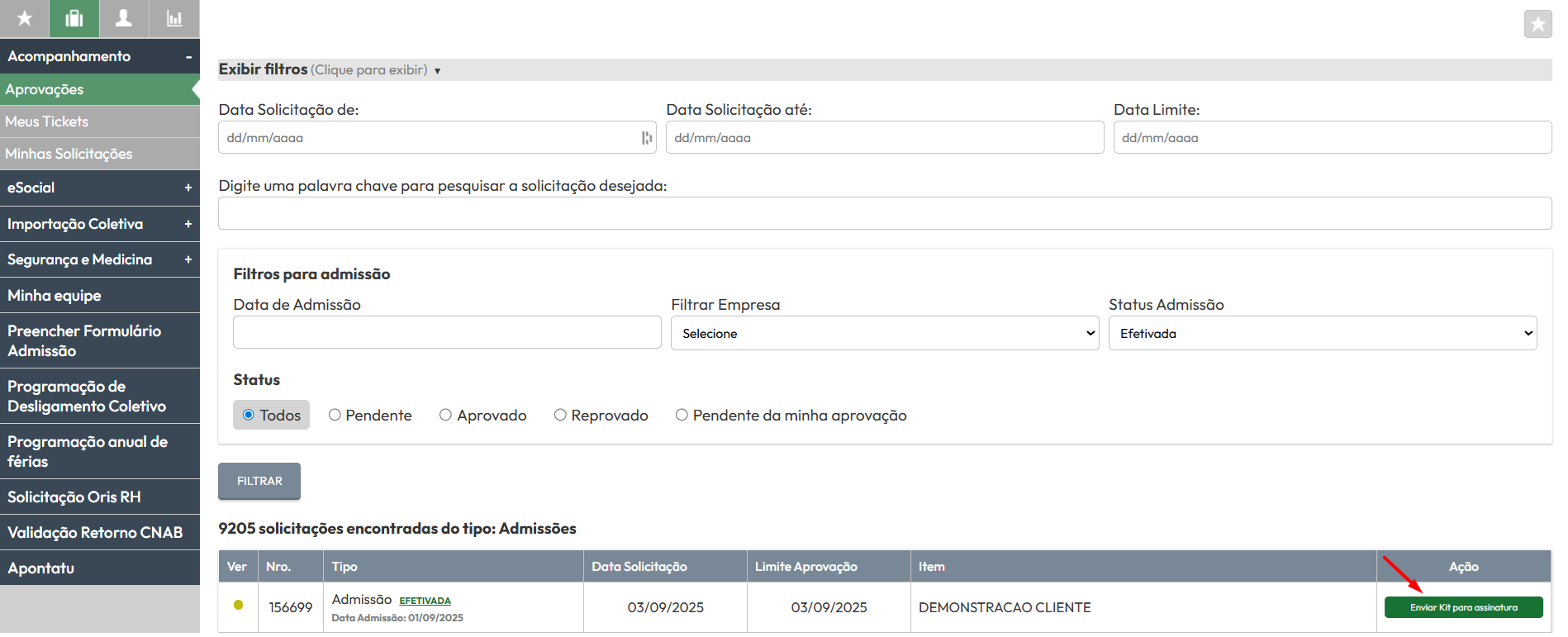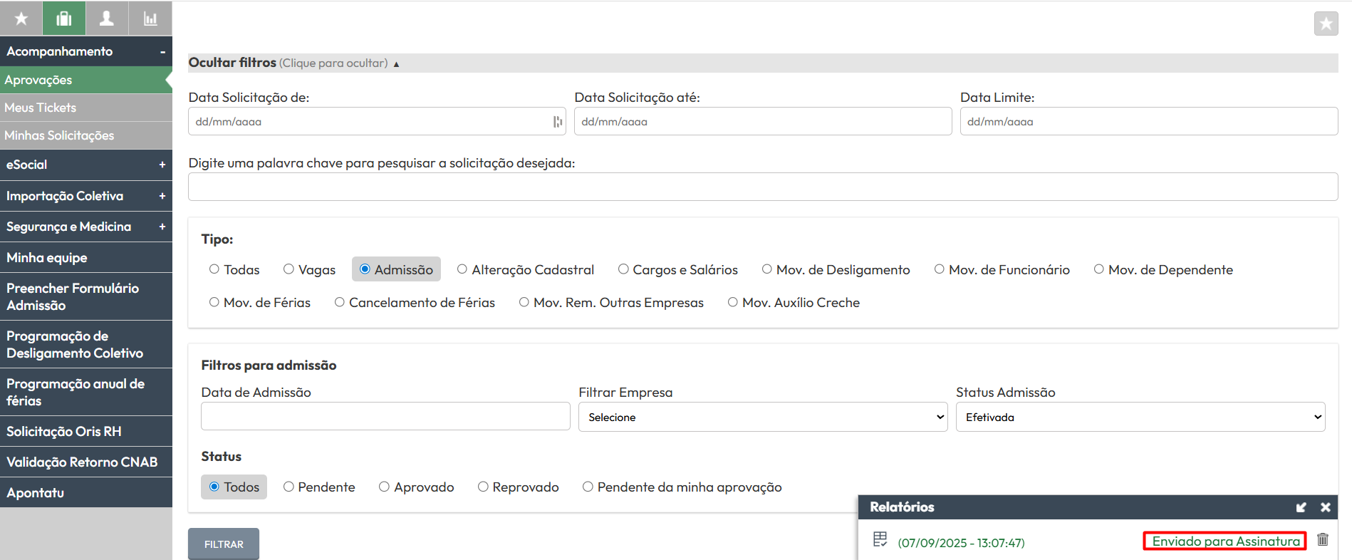Pode-se utilizar os filtros da tela para melhor visualização, selecionando Admissão e o status Efetivadas. Lembrando que essa funcionalidade se aplica somente para esse status de admissão. Será exibido o botão para enviar para assinatura.