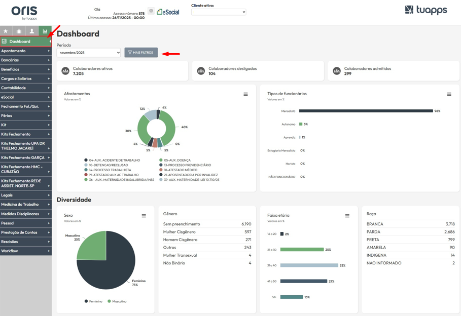 - Gráficos detalhados sobre afastamentos, tipos de colaboradores, diversidade, faixa etária e outras informações.
